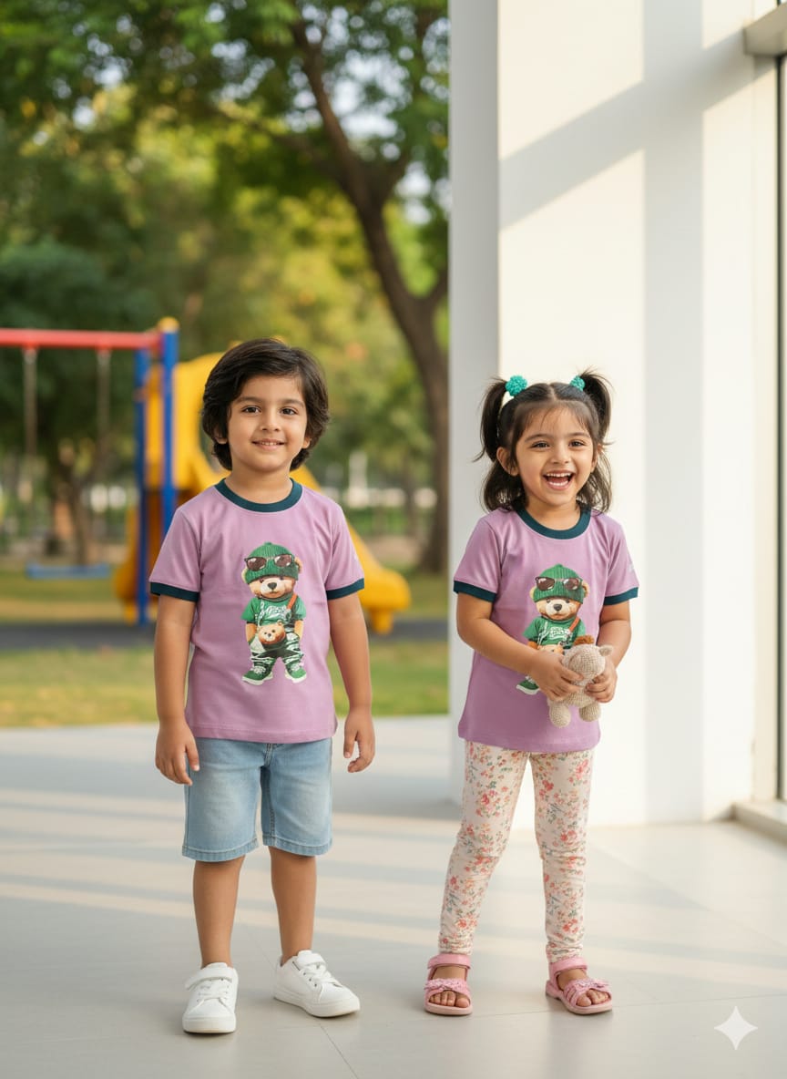 Kids cotton graphic T-shirt with trendy teddy bear print, lavender color, and contrast neckline for comfortable everyday wear.